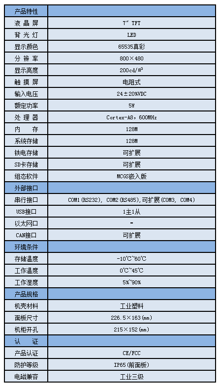 TPC7062TX,是一套以先進的Cortex-A8 CPU為核心(主頻600MHz)的高性能嵌入式一體化觸摸屏。該產品設計采用了7英寸高亮度TFT液晶顯示屏(分辨率800×480),四線電阻式觸摸屏(分辨率4096×4096)。同時還預裝了MCGS嵌入式組態軟件(運行版),具備強大的圖像顯示和數據處理功能。