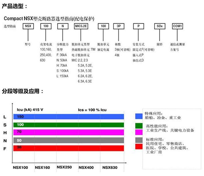 NSX系列塑料外殼式斷路器其額定絕緣電壓為950V,適用于交流50Hz或(60Hz),額定工作電壓690V及以下,額定工作電流12.5A至630A的電流中,用來分配電能,在正常條件下做不頻繁的閉合和斷開之用,并在線路和設(shè)備過載、欠電壓時起保護(hù)作用。額定殼架等級電流在400A及以下的斷路器,也可作鼠籠型電動機(jī)的不頻繁起動,運(yùn)轉(zhuǎn)中斷開以及在電動機(jī)過載,短路及欠電壓時起保護(hù)作用。