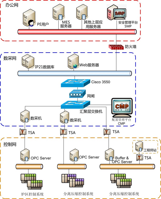 針對石化行業網絡當前的安全隱患,根據系統網絡結構和安全要求,可以將整個網絡分為辦公網、數采網、控制網和工程師站四大區域。