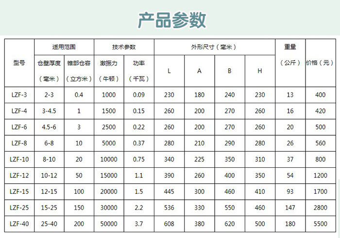 倉(cāng)壁振打器產(chǎn)品規(guī)格參數(shù)表:
